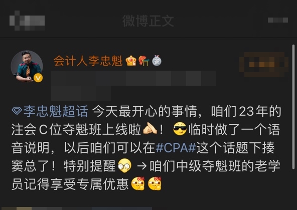 2023年注会的C位夺魁班已经正式上线了,喜欢李忠魁老师的同学一定不要错过哦,中级C位夺魁班的老学员还可以领取专属优惠哦,点击了解详情>>