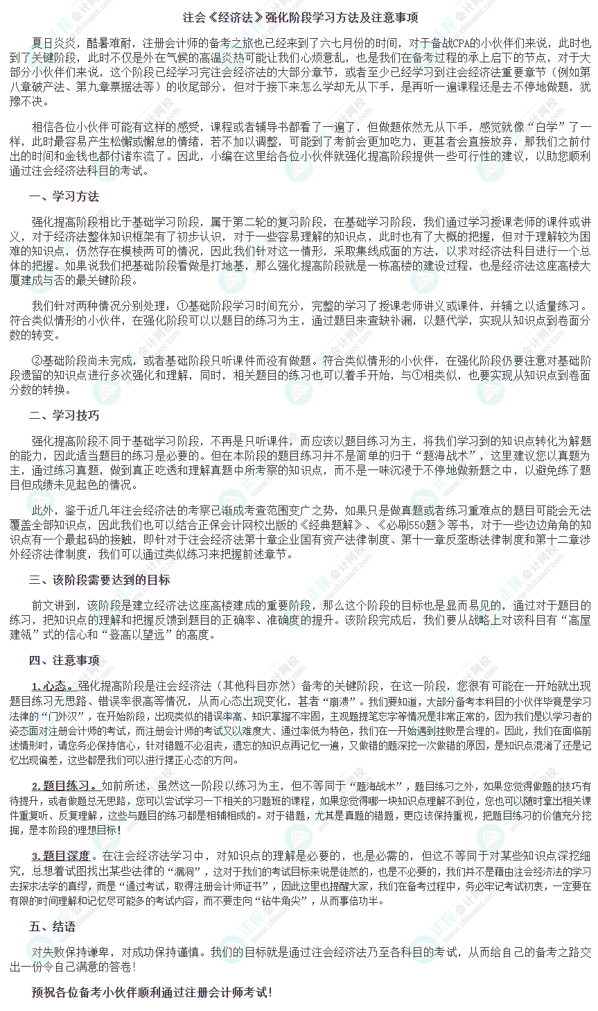 对于注会备考而言,每天每一点努力都将为您带来收获,这些收获都将会助您攀登到注册会计师的“巅峰”!为了帮助同学更好备战2022注册会计师,正保会计网校老师整理了强化阶段《经济法》学习方法及注意事项!请同学们查收!