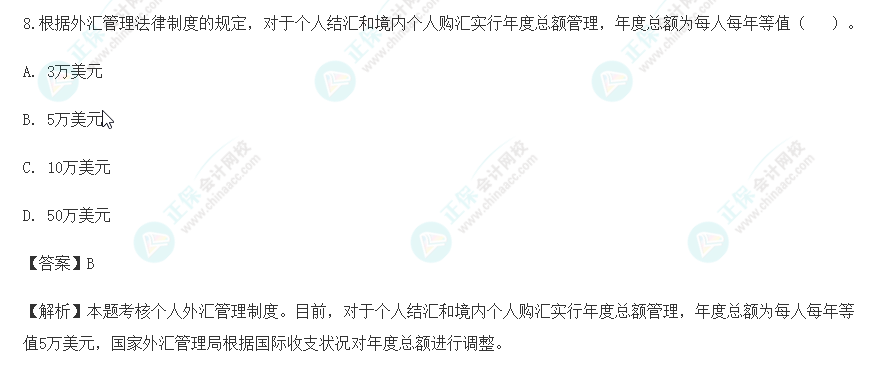 【点评】本题考核“个人外汇管理制度”的知识点。该题目所涉及知识点在下列正保会计网校(www.fawtography.com)2022年注册会计师考试辅导《经济法》中均有体现: