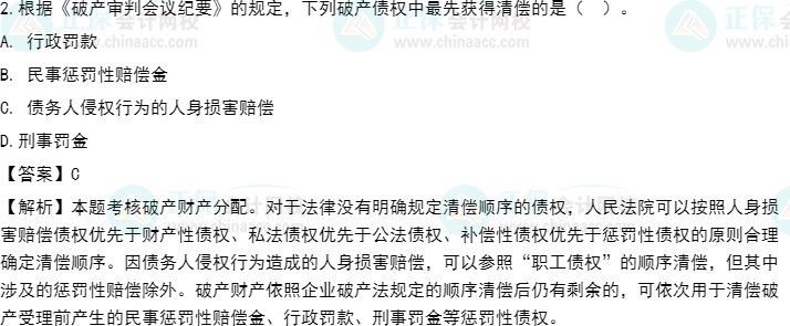 【点评】本题考核“破产财产分配”的知识点。该题目所涉及知识点在下列正保会计网校(www.fawtography.com)2022年注册会计师考试辅导《经济法》中均有体现: