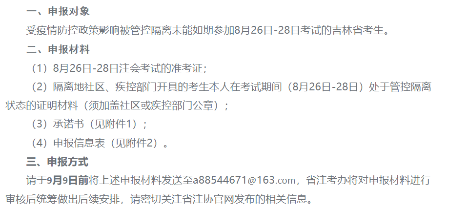 吉林省相关考生:可进行申报,省注考办将对申报材料进行审核后统筹做出后续安排,请密切关注省注协官网发布的相关信息。
