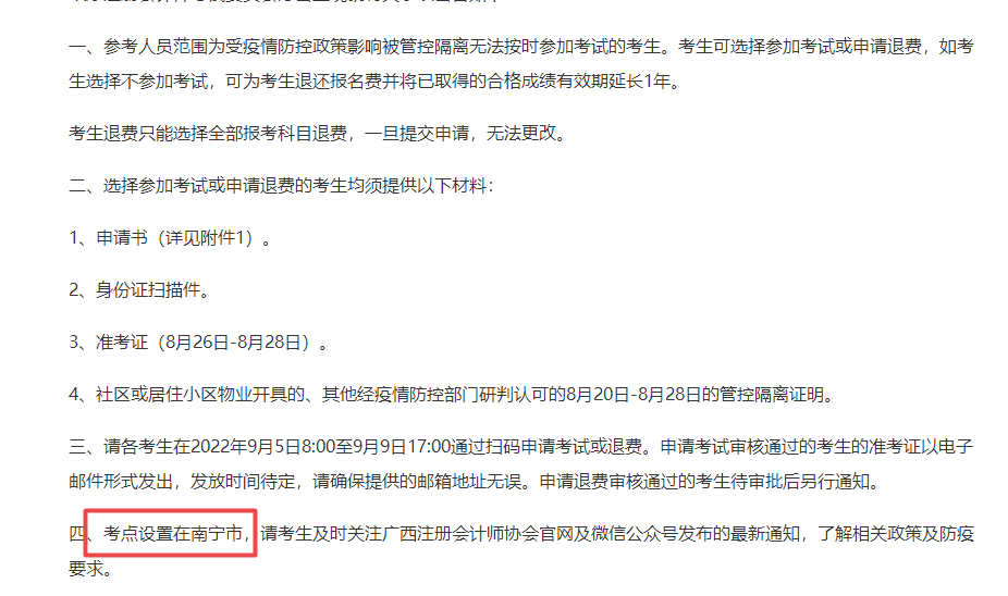 广西:考生可选择参加考试或申请退费,如考生选择不参加考试,可为考生退还报名费并将已取得的合格成绩有效期延长1年。考点设置在南宁市。