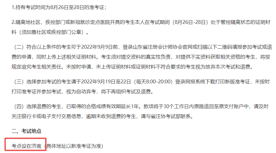 山东省:可申请参加考试或申请退费。考点设在济南。