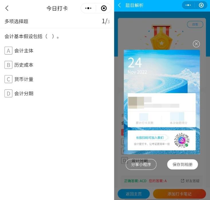 第一步:进入会计爱打卡小程序,选择科目后点击免费参加--做题打卡,进入做题页面,在做题前可以先学习下知识点。