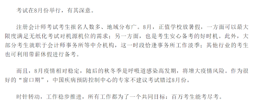 8月27日,中注协转载了一篇《中国会计报》的文章:为了百万考生能考尽考 ——2022年注册会计师全国统一考试如期开考侧记,文章的末尾提到了这么安排的原因: