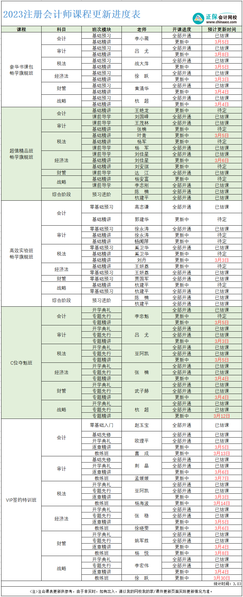 2023年注会考试教材发布(查看教材变动对比>>),网校注册会计师各个班次的基础新课也已开讲,那课程更新到哪里了你知道吗?注会2023年课表已备好(点击试听>>),同学们抓紧时间学习啦!
