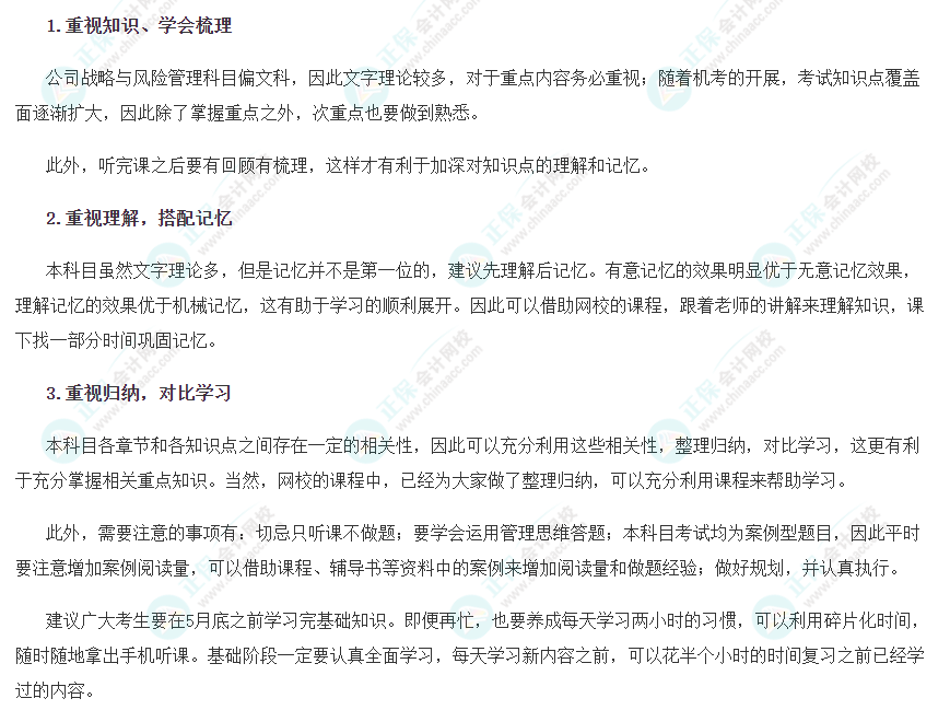 公司战略与风险管理科目偏文科,因此文字理论较多,对于重点内容务必重视。建议先理解后记忆。有意记忆的效果明显优于无意记忆效果,理解记忆的效果优于机械记忆,这有助于学习的顺利展开。