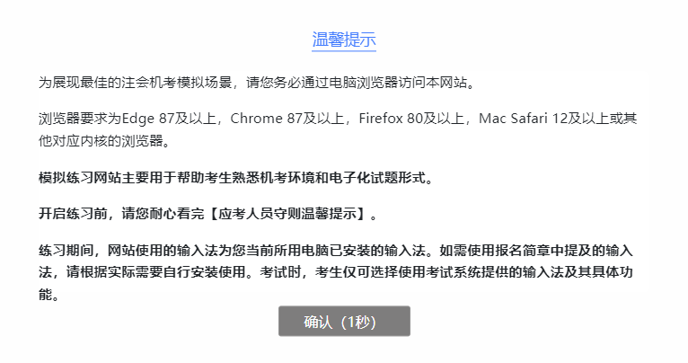 机考模拟练习系统要求计算机浏览器为Edge87及以上,Chrome87及以上,Firefox80及以上,Mac Safari 12及以上或其他对应内核的浏览器。屏幕显示分辨率为1024*768以上。