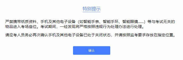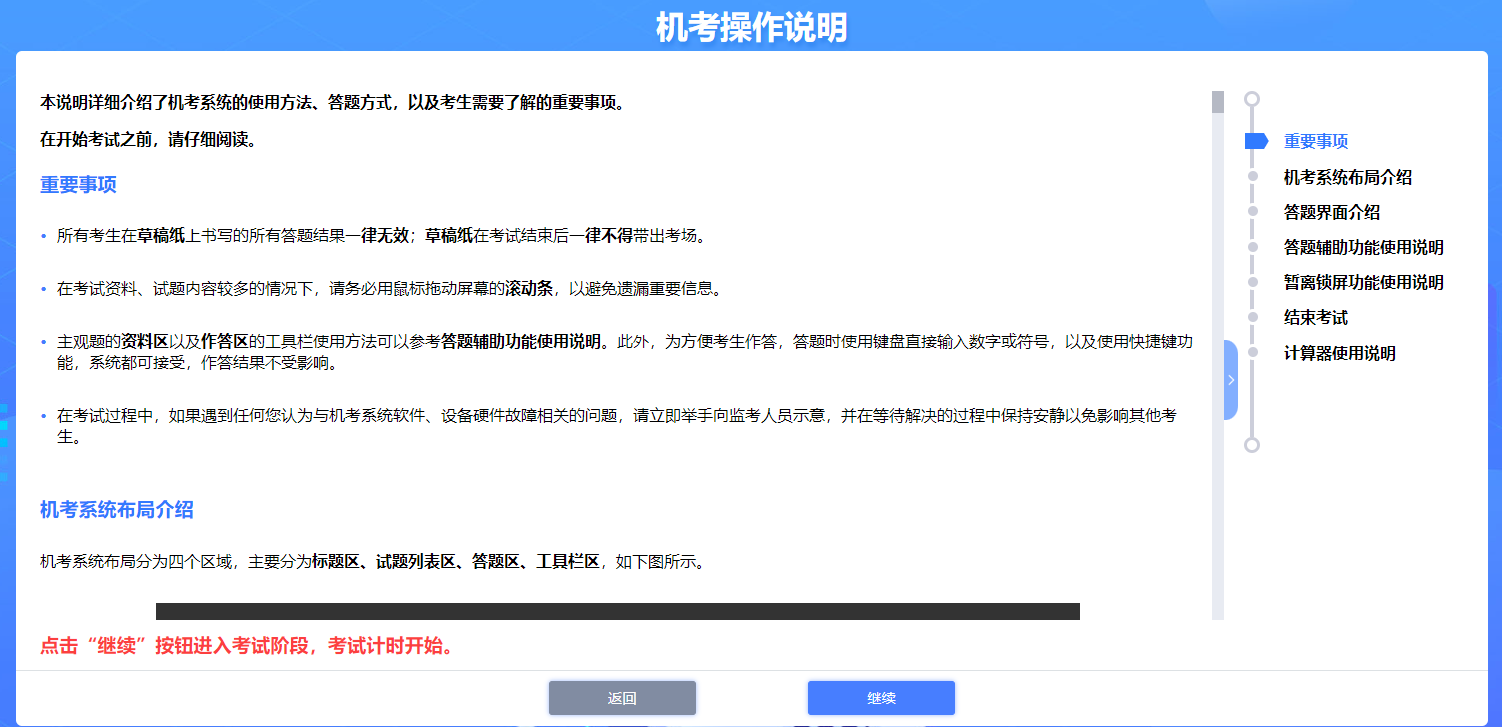 八、查看机考操作说明,了解后点击“继续”,这时会再次弹出一个“特别提示”,请认真阅读,确认没有问题后,点击“继续”进入下一步。