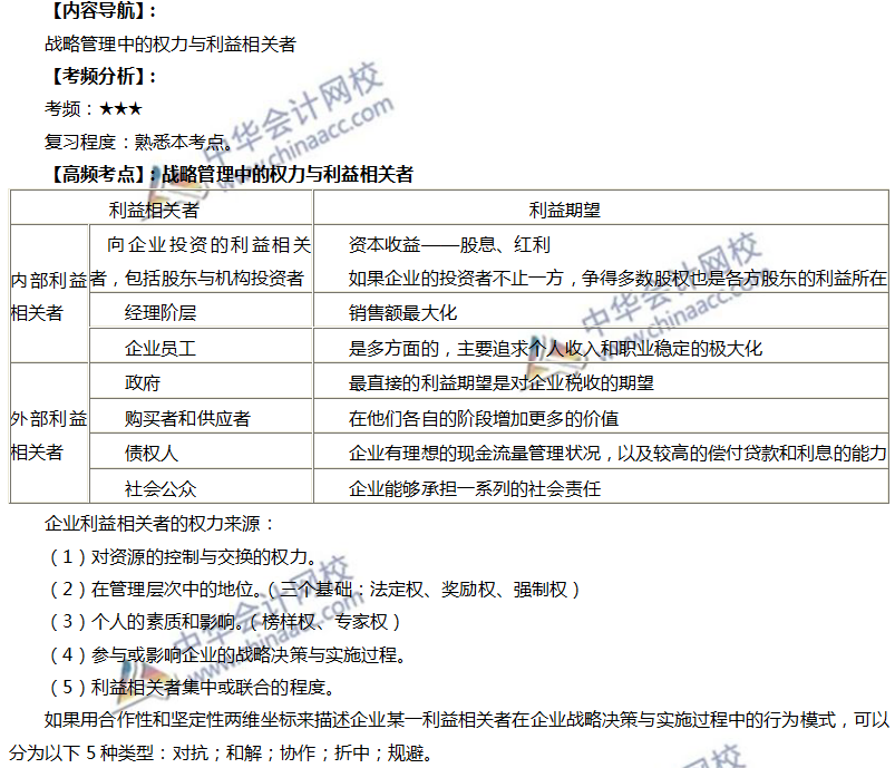 备考时间紧张,抓紧时间抓住重点备考注册会计师吧!正保会计网校教学老师为广大考生整理了高频考点,跟随网校的脚步,我们一起来学习2019年《公司战略与风险管理》高频考点:战略管理中的权力与利益相关者。本考点属于《公司战略与风险管理》第四章战略实施第四节战略管理中的权力与利益相关者的内容。