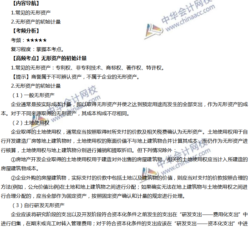 2019年注册会计师备战全面展开,为了能让注会的各位小伙伴在今年的注会备考中步步为营,正保会计网校的各位老师为大家整理了《会计》各章高频考点。我们一起来学习2019《会计》高频考点:无形资产的初始计量。本考点属于《会计》第五章无形资产第一节无形资产的确认和初始计量和第二节内部研究开发支出的确认和计量的内容。