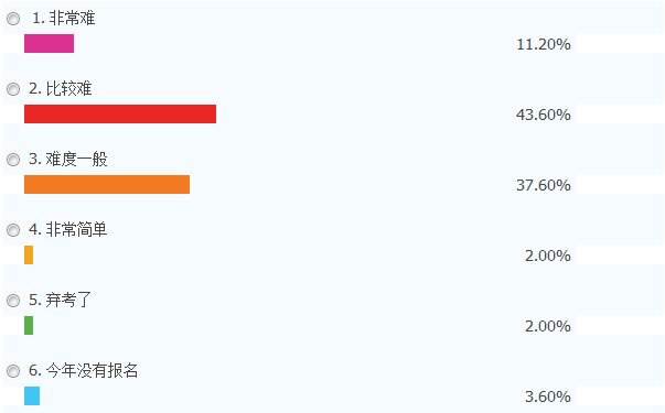 2018注会《财管》考试结束后,正保会计网校进行了难度调查,“比较难”、“难度一般”的占比基本持平,“非常难”占比也不小。到底难度如何,考完试的小伙伴快去投票>>