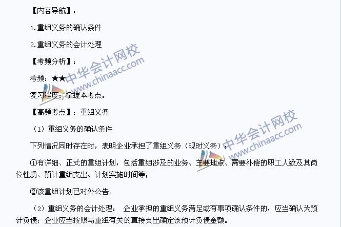 我们一起来学习2013注册会计师《会计》高频考点:重组义务。本考点属于《会计》第十三章或有事项第三节或有事项会计的具体应用的内容。