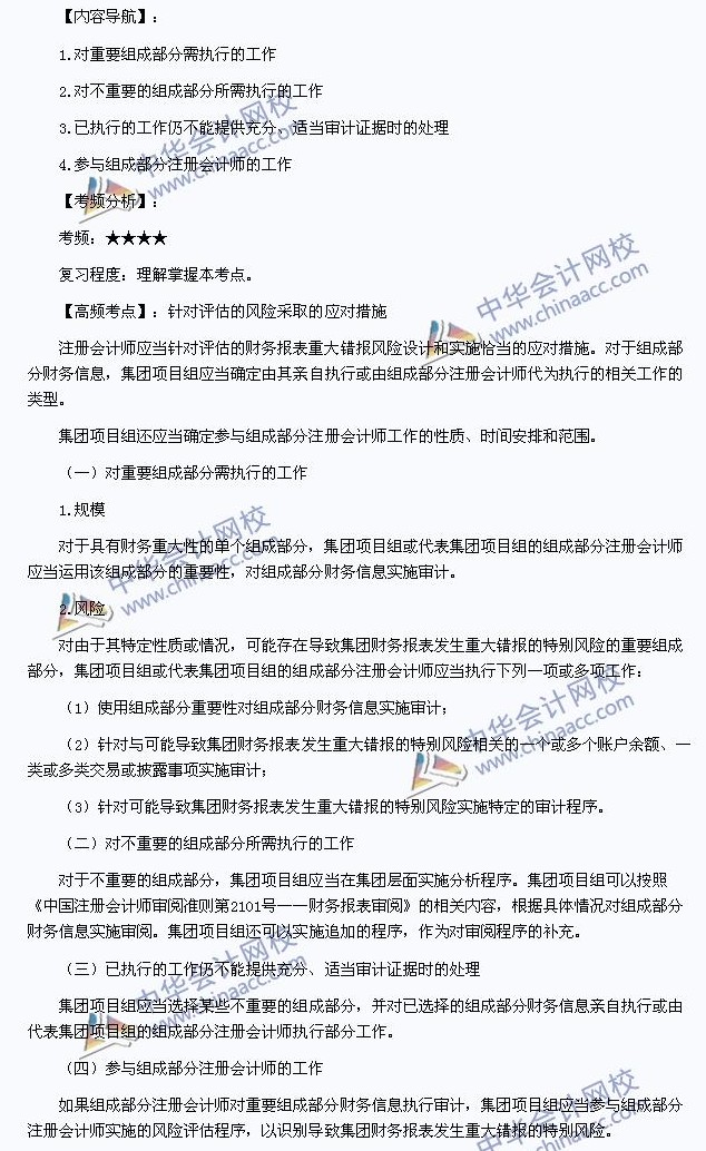 我们一起来学习2013注册会计师《审计》高频考点:针对评估的风险采取的应对措施。本考点属于《审计》第二十章对集团财务报表审计的特殊考虑第七节针对评估的风险采取的应对措施的内容。