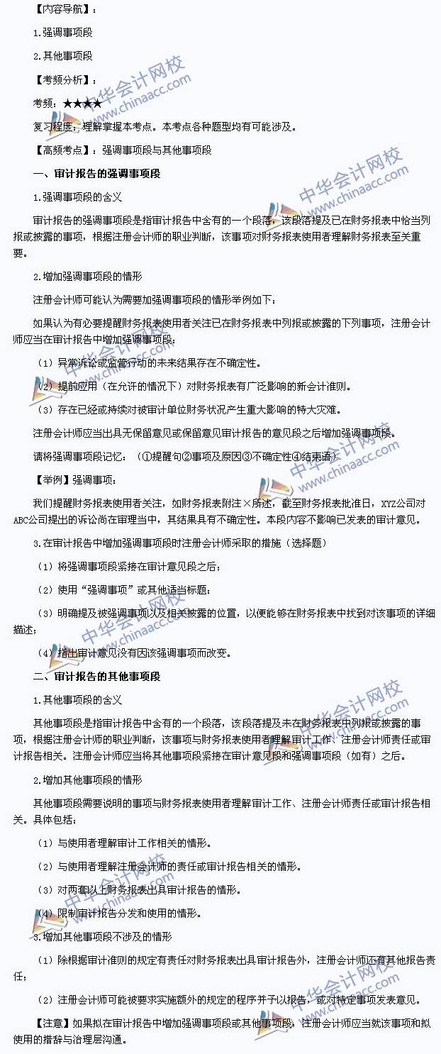 我们一起来学习2013注册会计师《审计》高频考点:强调事项段与其他事项段。本考点属于《审计》第二十三章审计报告第四节非标准审计报告的内容。