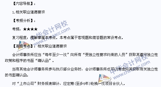 我们一起来学习2013注册会计师《审计》高频考点:相关职业道德要求。本考点属于《审计》第二十四章会计师事务所业务质量控制第二节相关职业道德要求的内容。