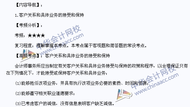 我们一起来学习2013注册会计师《审计》高频考点:客户关系和具体业务的接受和保持。本考点属于《审计》第二十四章会计师事务所业务质量控制第三节客户关系和具体业务的接受和保持的内容。