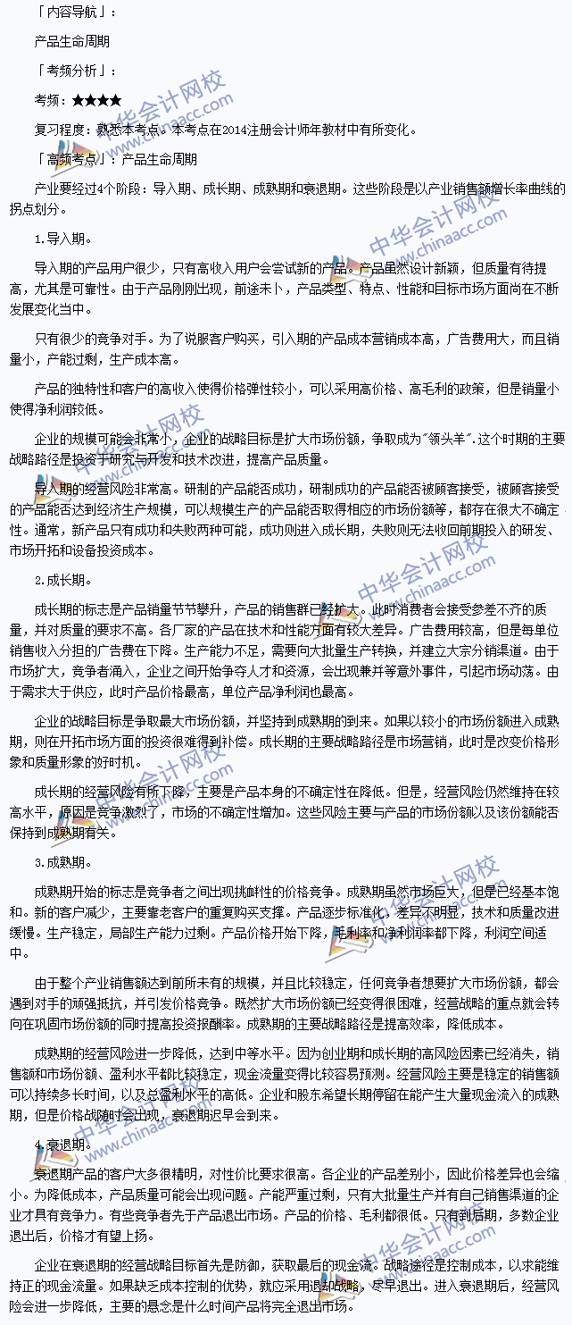我们一起来学习2014注册会计师《公司战略与风险管理》高频考点:产品生命周期。本考点属于《公司战略与风险管理》第二章战略分析第一节企业外部环境分析的内容。