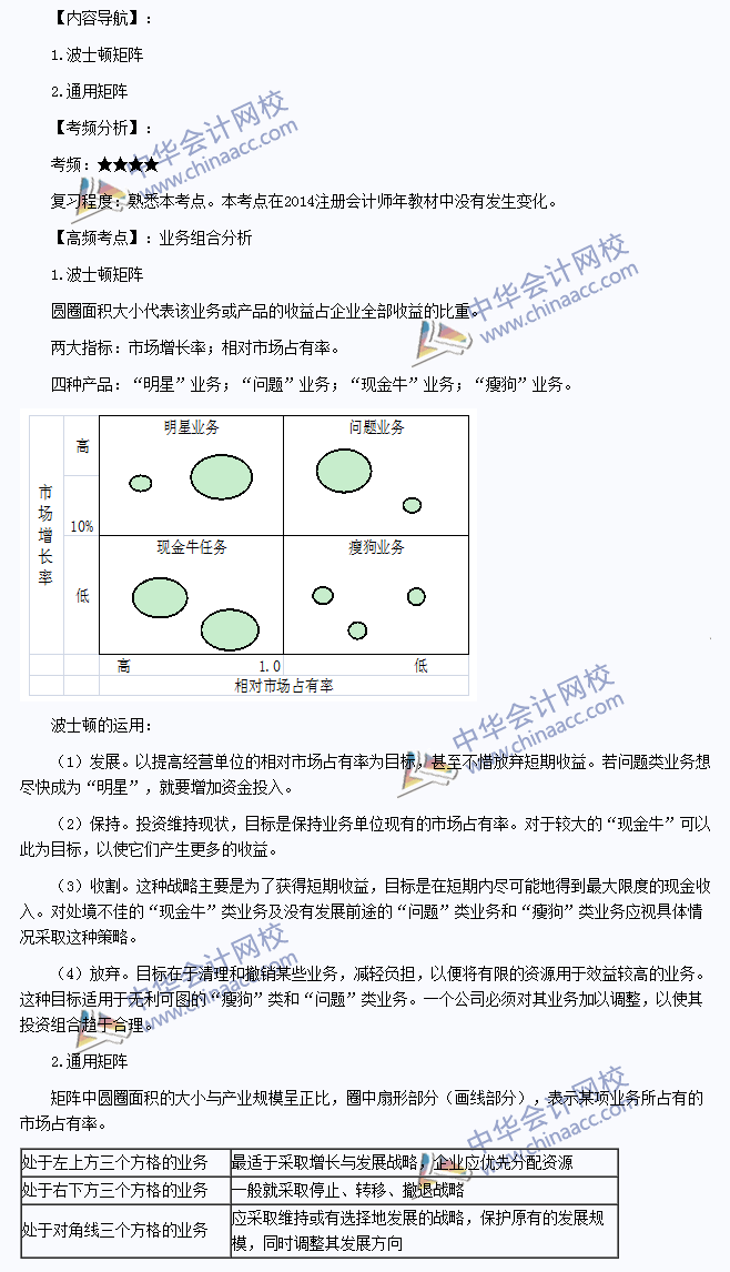 我们一起来学习2014注册会计师《公司战略与风险管理》高频考点:业务组合分析。本考点属于《公司战略与风险管理》第二章战略分析第二节企业内部环境分析的内容。