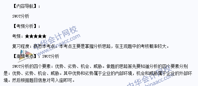 我们一起来学习2014注册会计师《公司战略与风险管理》高频考点:SWOT分析。本考点属于《公司战略与风险管理》第二章战略分析第三节SWOT分析的内容。