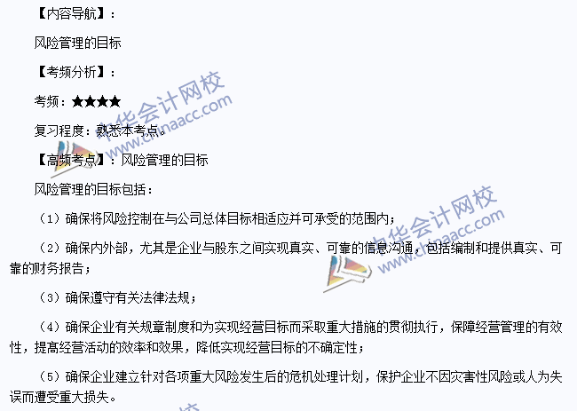 我们一起来学习2014注册会计师《公司战略与风险管理》高频考点:风险管理的目标。本考点属于《公司战略与风险管理》第五章风险与风险管理第二节风险管理的目标的内容。