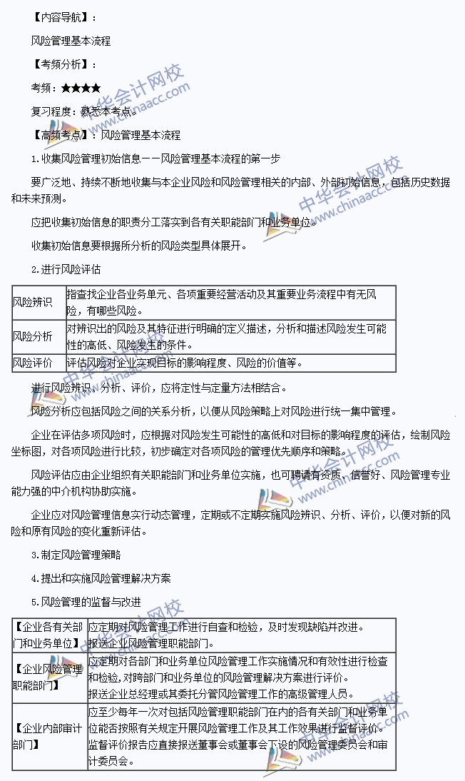 我们一起来学习2014注册会计师《公司战略与风险管理》高频考点:风险管理基本流程。本考点属于《公司战略与风险管理》第五章风险与风险管理第三节风险管理基本流程的内容。