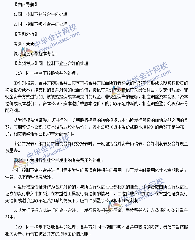 我们一起来学习2014注册会计师《会计》高频考点:同一控制下企业合并的处理。本考点属于《会计》第二十四章企业合并第二节同一控制下企业合并的处理的内容。