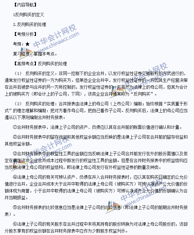 我们一起来学习2014注册会计师《会计》高频考点:反向购买的处理。本考点属于《会计》第二十四章企业合并第三节非同一控制下企业合并的处理的内容。
