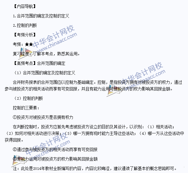 我们一起来学习2014注册会计师《会计》高频考点:合并范围的确定。本考点属于《会计》第二十五章合并财务报表第二节合并范围的确实的内容。