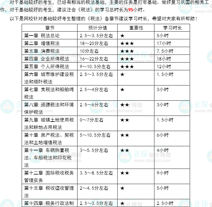 2023年注会新考季已经开始了,作为基础比较好的考生,可以来看看网校老师整理的注会《税法》每章建议学习时长~