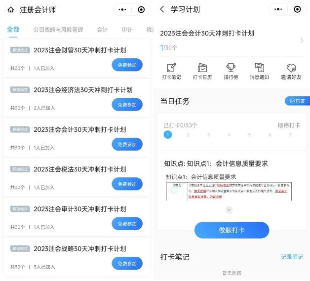 为了督促大家学习,正保会计网校为大家准备了注册会计师2023年冲刺阶段打卡计划!全程免费参与!考前突击,每天5分钟,直击必考点!是不是很赞?还没有参与的小伙伴快来免费参与吧~