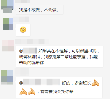 其实在2018注会私教直播班,你就可以发现学习当中的一些小美好,当你做题遇到困难时、复习感到迷茫时,总会有人向你伸出援助之手,告诉你注会之路你不是一个人: