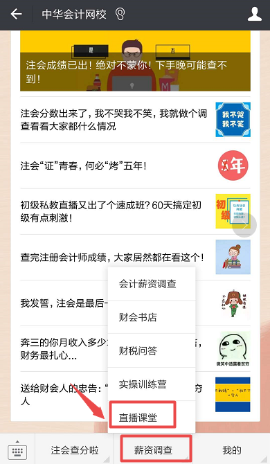 关注正保会计网校微信官方公众号微信号:wx_chinaacc,点击菜单中间——【直播课堂】——进入本次直播交流教室【2018年注会考试备考策略】。