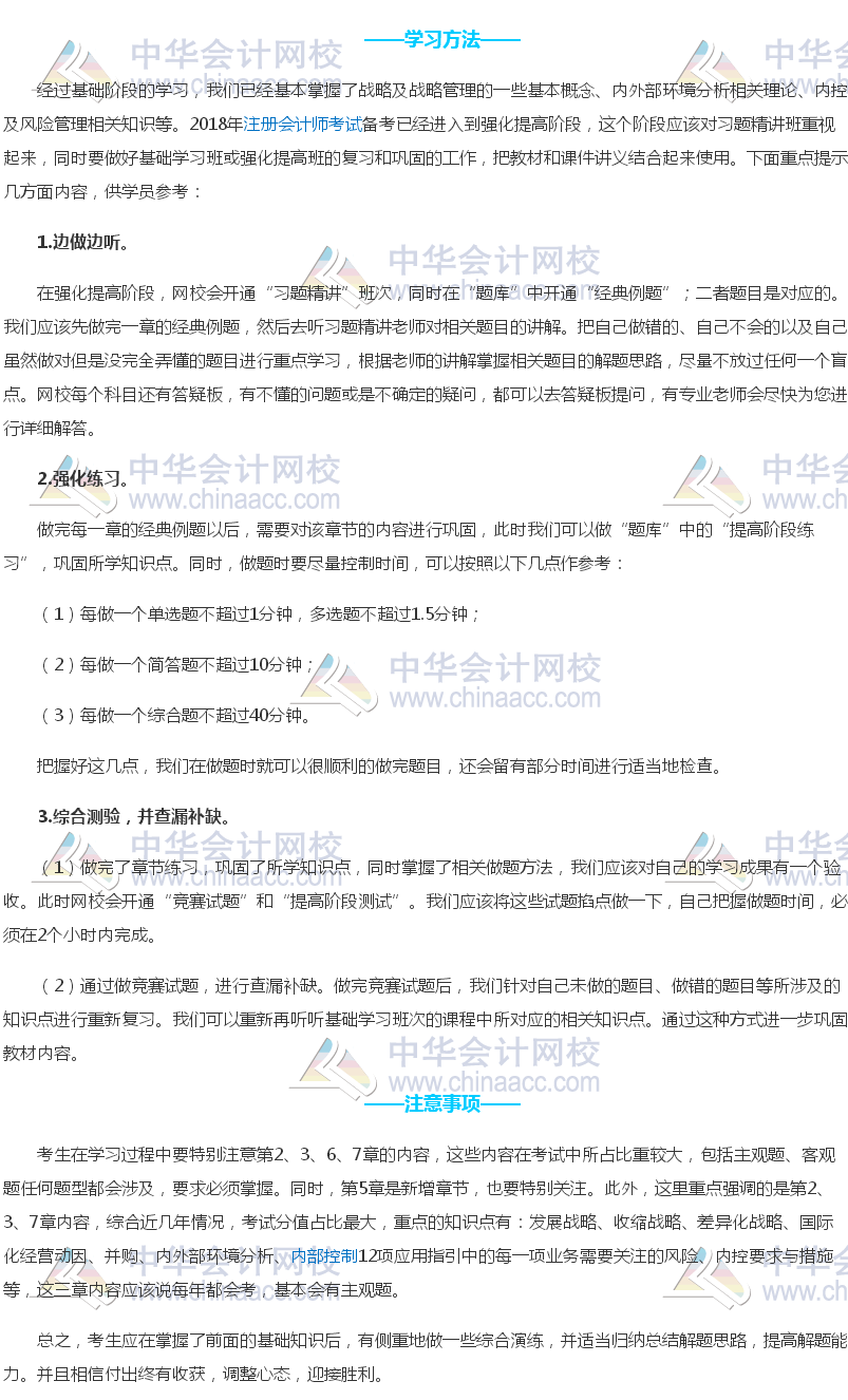考生在学习过程中要特别注意第2、3、6、7章的内容,这些内容在考试中所占比重较大,包括主观题、客观题任何题型都会涉及,要求必须掌握。考生应在掌握了前面的基础知识后,有侧重地做一些综合演练,并适当归纳总结解题思路,提高解题能力。正保会计网校教学专家整理了注会《公司战略与风险管理》强化提高阶段学习方法及注意事项,希望对考生有所帮助。