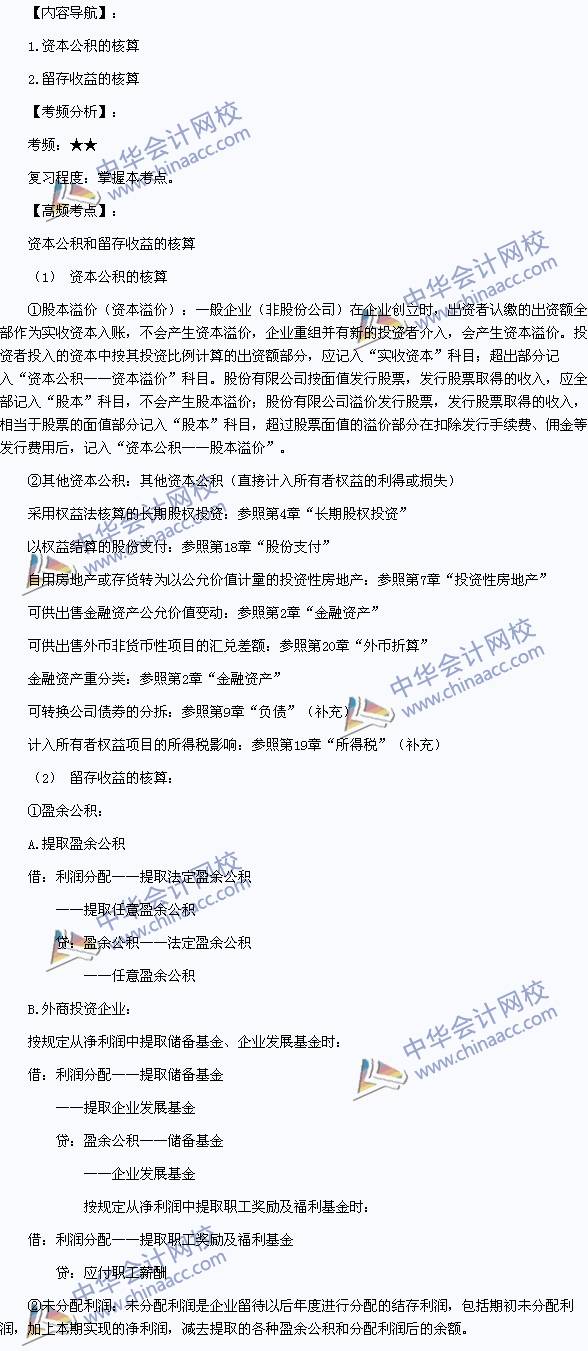 我们一起来学习2013注册会计师考试《会计》高频考点:资本公积和留存收益的核算。本考点属于《会计》第十章所有者权益第三节资本公积和第四节留存收益的内容