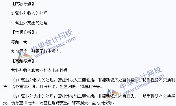 我们一起来学习2013注册会计师考试《会计》高频考点:营业外收入和营业外支出的处理。本考点属于《会计》第十一章收入、费用和利润第二节费用的内容。