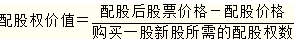 | 配股权价值计算 | 一般来说,老股东可以以低于配股前股票市场的价格购买所配发的股票,即配股权的执行价格低于当前股票价格,此时配股权是实值期权,因此配股权具有价值。 利用除权后股票的价值可以估计配股权价值。配股权的价值为: |