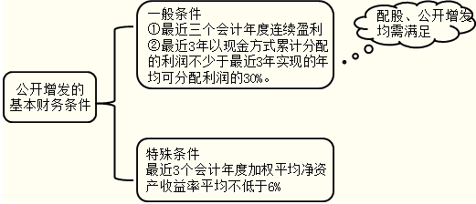 | 特别规定 | 【公开增发】 除满足上市公司公开发行的一般规定外,还应当满足下列规定: ① 最近3个会计年度加权平均净资产收益率平均不低于6%; ② 除金融企业外,最近1期期末不存在持有金额较大的交易性金融资产和可供出售金融资产、借予他人款项、委托理财等财务性投资的情形。 【非公开增发】 没有过多发行条件上的限制,一般只要发行对象符合要求,并且不存在一些严重损害投资者合法权益和社会公共利益的情形均可申请非公开发行股票。(发行对象在数量上不超过10名) 【提示】对于一些以往盈利记录未能满足公开融资条件,但又面临重大发展机遇的公司而言,非公开增发提供了一个关键性的融资渠道。 |