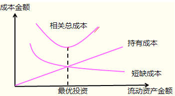 | 最优投资规模 | ![]() 流动资产最优的投资规模,取决于持有成本和短缺成本总计的最小化。企业持有成本随投资规模而增加,短缺成本随投资规模而减少,在两者相等时达到最佳的投资规模。 |