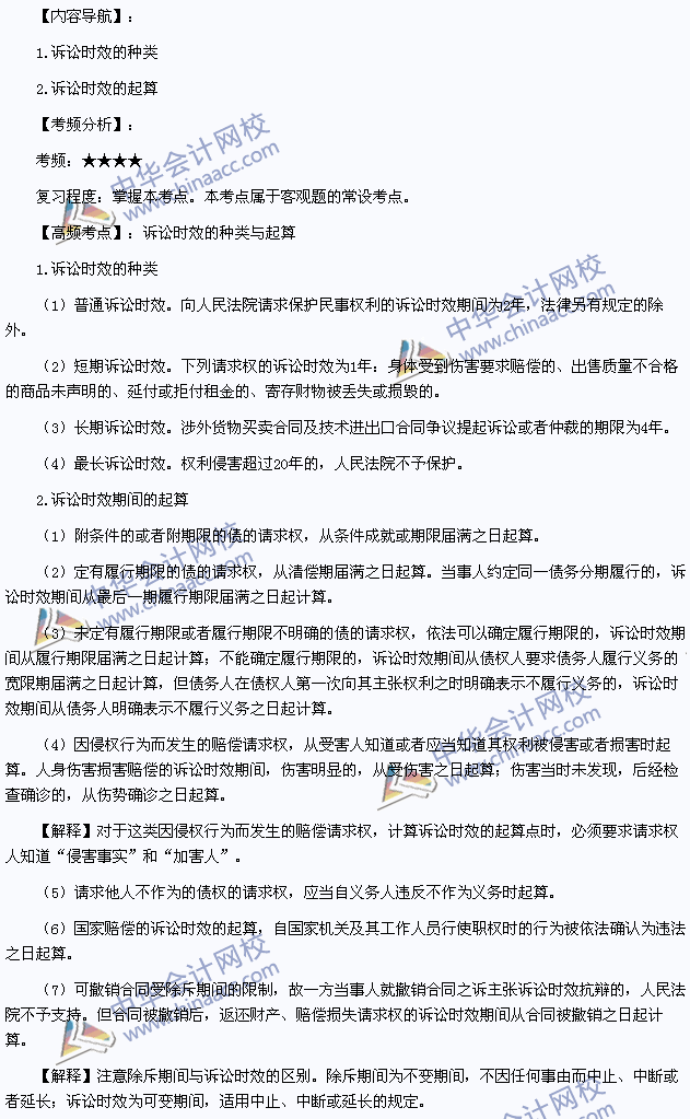 我们一起来学习2014年注册会计师《经济法》高频考点:诉讼时效的种类与起算。本考点属于《经济法》第二章基本民事法律制度第三节诉讼时效制度的内容。