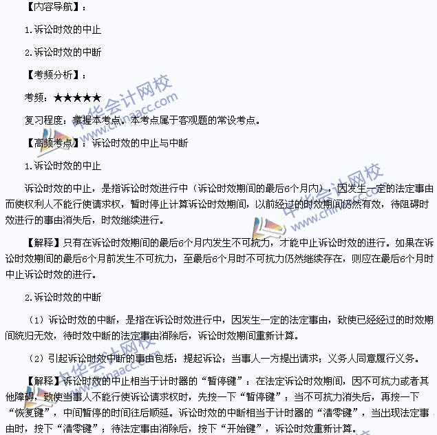 我们一起来学习2014年注册会计师《经济法》高频考点:诉讼时效的中止与中断。本考点属于《经济法》第二章基本民事法律制度第三节诉讼时效制度的内容。