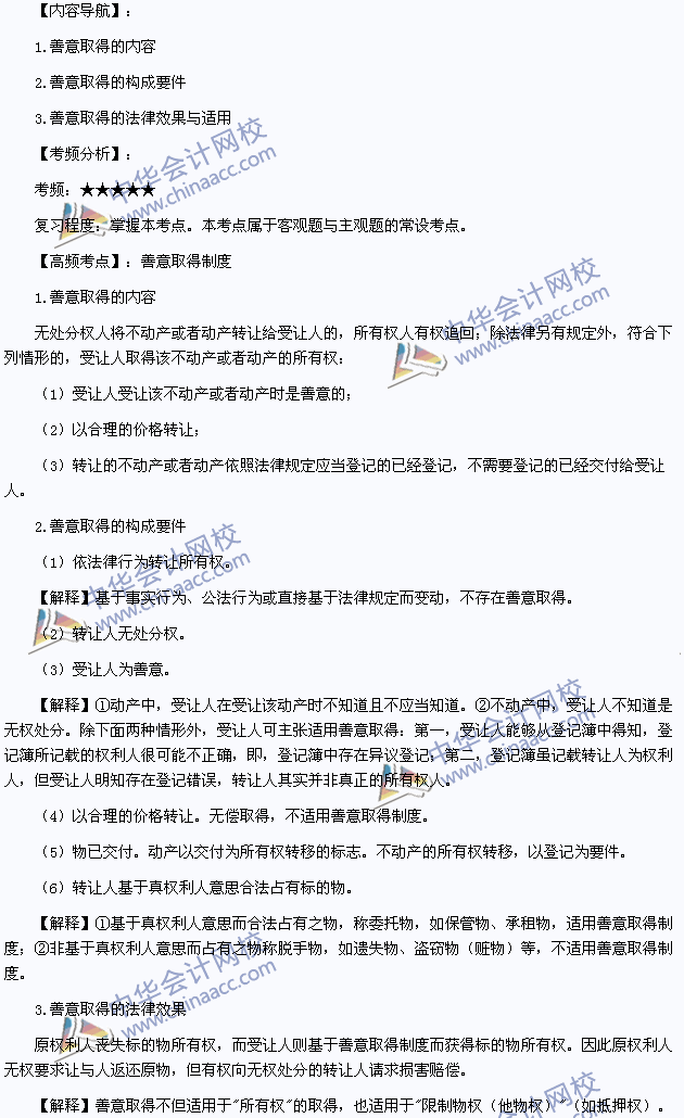 我们一起来学习2014年注册会计师《经济法》高频考点:善意取得制度。本考点属于《经济法》第三章物权法律制度第三节所有权的内容。