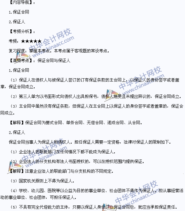 我们一起来学习2014年注册会计师《经济法》高频考点:保证合同与保证人。本考点属于《经济法》第四章合同法律制度第五节合同的担保的内容。