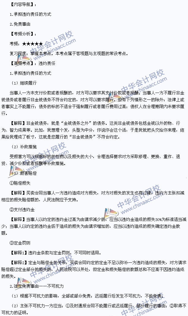 我们一起来学习2014年注册会计师《经济法》高频考点:违约责任。本考点属于《经济法》第四章合同法律制度第八节违约责任的内容。