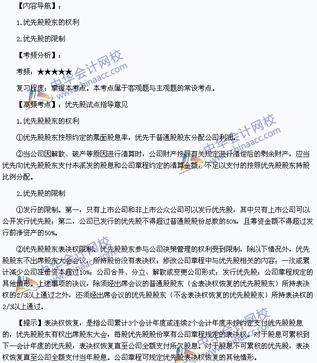我们一起来学习2014年注册会计师《经济法》高频考点:优先股试点指导意见。本考点属于《经济法》第六章公司法律制度第二节股份有限公司的内容。
