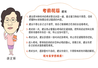 2、临近考试这几天,建议不要让自己过于疲劳,使自己能够精力充沛的去迎接考试。