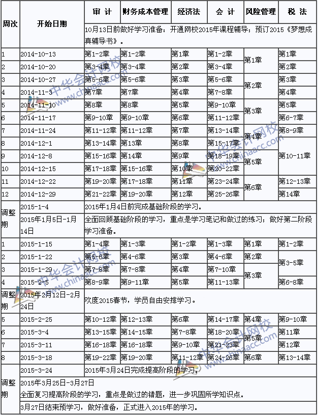 1、整体进度说明:本计划表从2014年10月13日开始执行,计划于2015年3月27日结束,共计24周;其中:基础阶段安排12周,提高(练习)阶段安排8周,复习调整期安排4周(含春节假期)。学员可根据本表的提示,结合自己的工作,学习情况进行细化,并按网校要求完成听课、做题的学习任务,基本可满足考试需要。