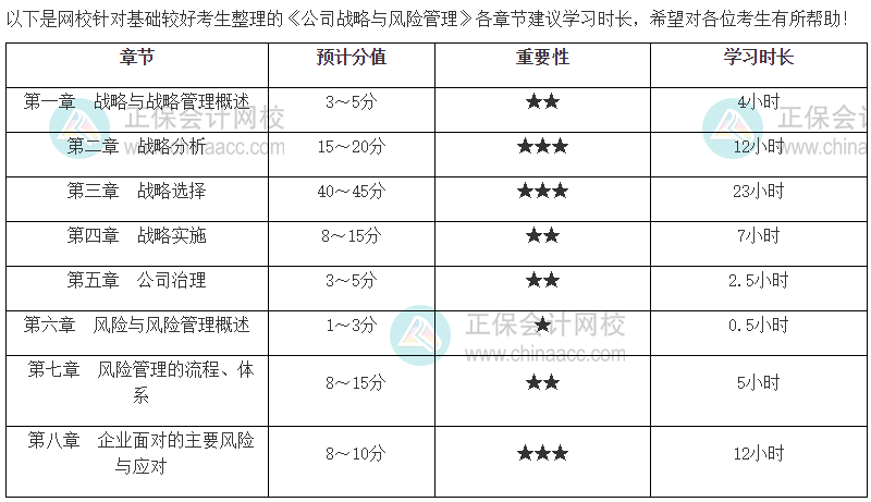 2024年注册会计师备考已开始,你学了吗?学习注册会计师《公司战略与风险管理》科目需要花费多长时间?以下是网校教务老师为大家提供的注会战略各章节重要性及建议学习时长,快来了解~