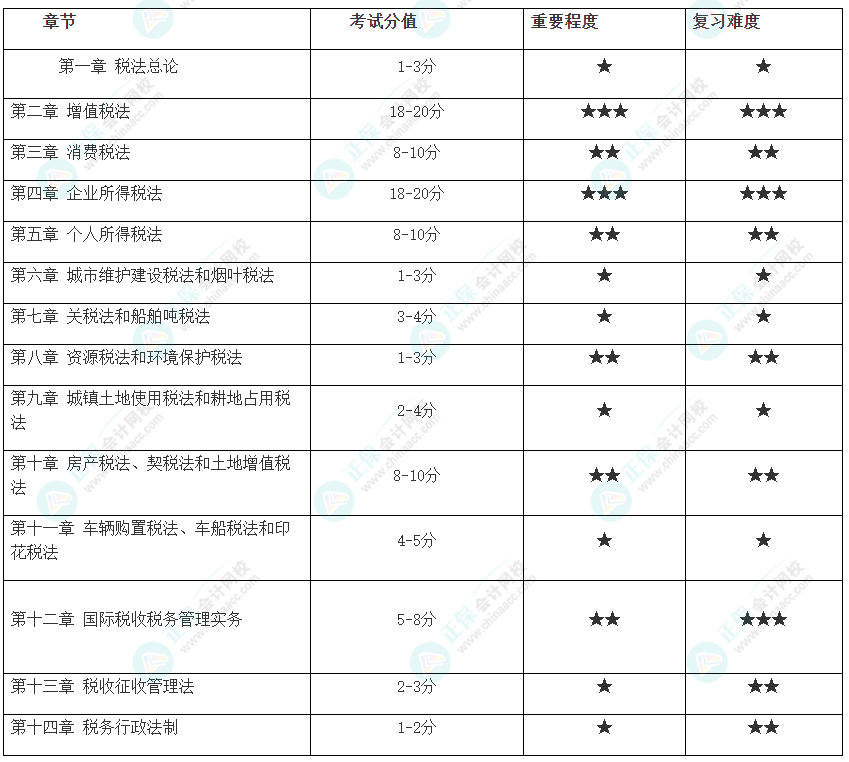 为助力大家高效备考,网校教务老师特整理了注册会计师《税法》各章具体的考试分值、重要程度及复习难度,快来了解!