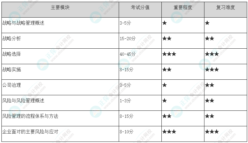 快来看网校教务老师为大家整理的注会《公司战略与风险管理》考试各模块重要程度和考试分值分布吧↓